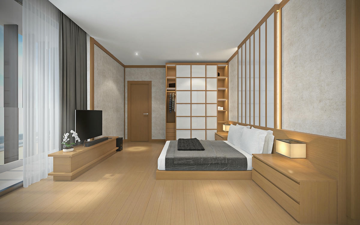 Không gian này thường sử dụng gam màu trung tính như trắng, xám, nâu đất với các điểm nhấn nhẹ nhàng như vải vóc, đèn trang trí, tranh nghệ thuật. Chất liệu cao cấp như gỗ tự nhiên hoặc veneer giúp tạo cảm giác ấm cúng, sang trọng.